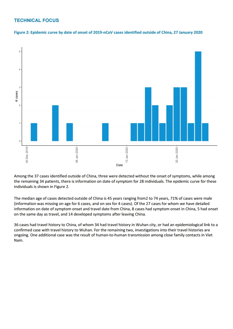 THERE HAVE BEEN 2,798 CONFIRMED CASES OF THE DISEASE GLOBALLY, 2,741 OF WHICH WERE IN CHINA. THIRTY-SEVEN CASES HAVE BEEN REPORTED IN 11 OTHER COUNTRIES, 36 OF WHICH HAD TRAVEL HISTORY TO CHINA, AND 34 RELATED TO TRAVEL IN WUHAN.