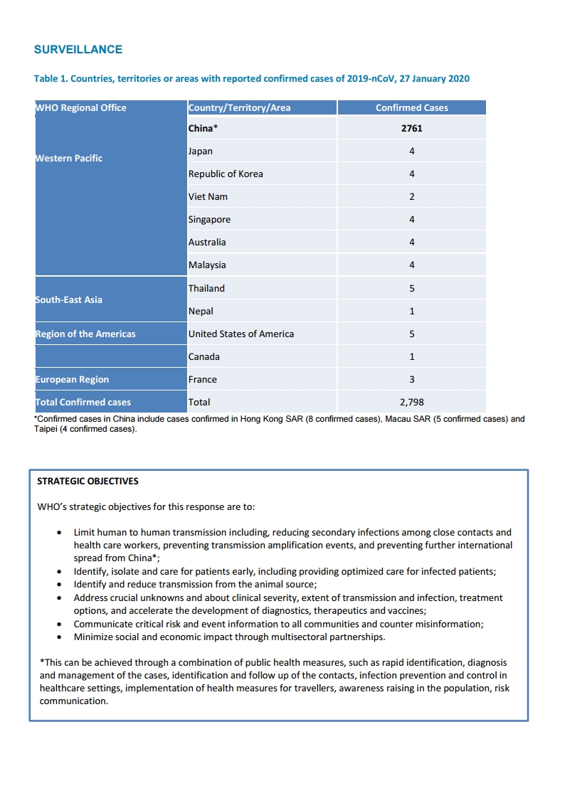 WHO said its strategic objectives during the outbreak include limiting human-to-human transmission and identifying patients early.